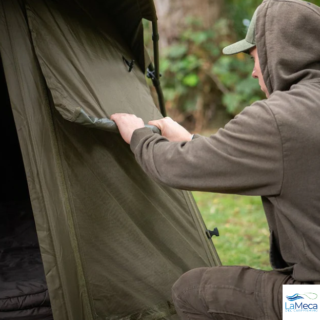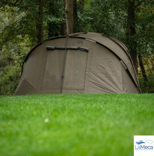 Refugio de la marca Fox, modelo EOS MK2, de 2 personas, en color caqui, especial para la pesca de carpfishing.