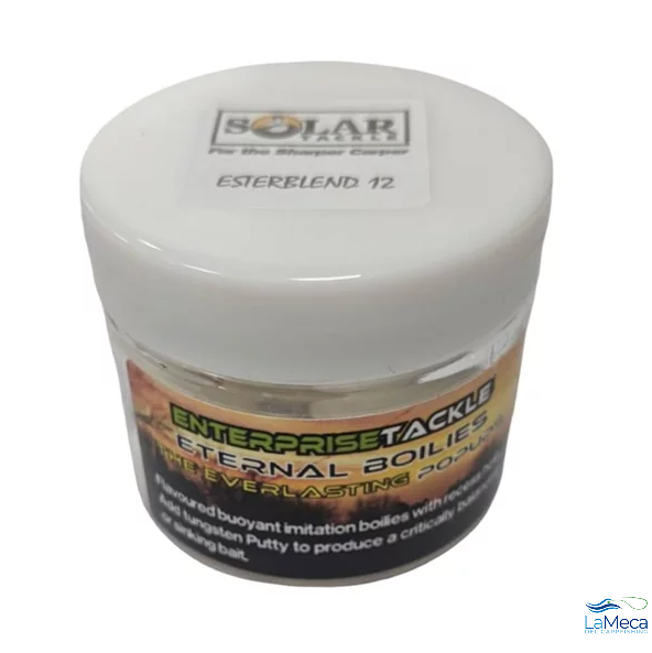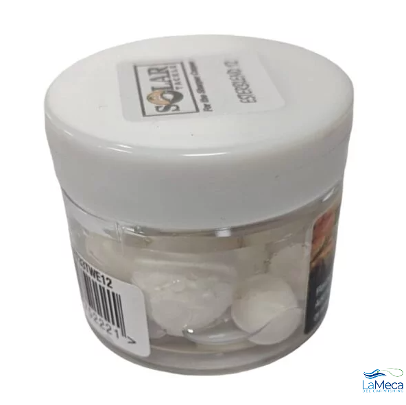 boilies de imitacion flotantes en aroma concentrado de ESTERBLEND 12 (afrutado) Botes de 8 unidades de boilies artificiales flotantes variados de 12-15-18 mm y dumbels (boileis alargados) color blanco con el famoso remojo de ESTERBLEND 12 de Solar Tackle, aroma afrutado muy intenso y efectivo.